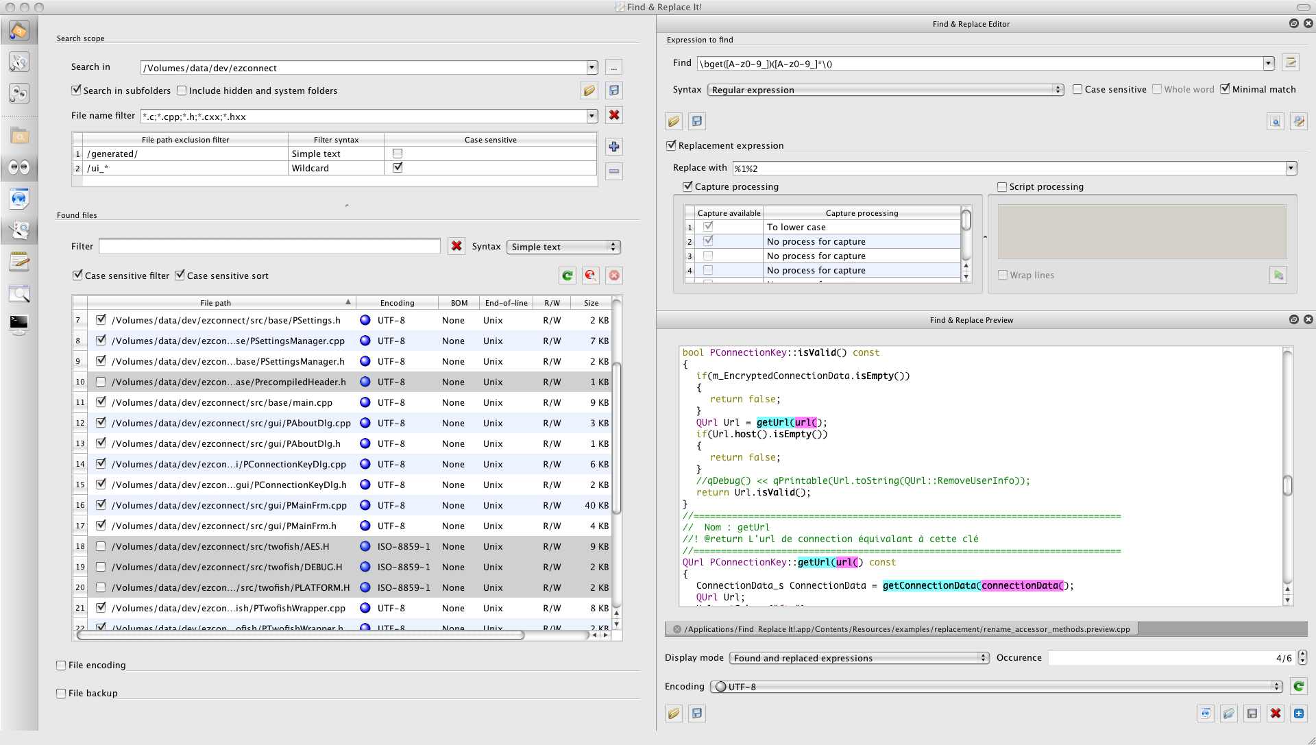 It allows performing very complex batch replacements inside text files of any size. It supports regular expression syntax and dozens of encodings charsets. It has scripting capabilities which allow transforming on the fly the replacement text for every matched string. It also handles batch processing of the encoding of files, as well as of types of end-of-lines.